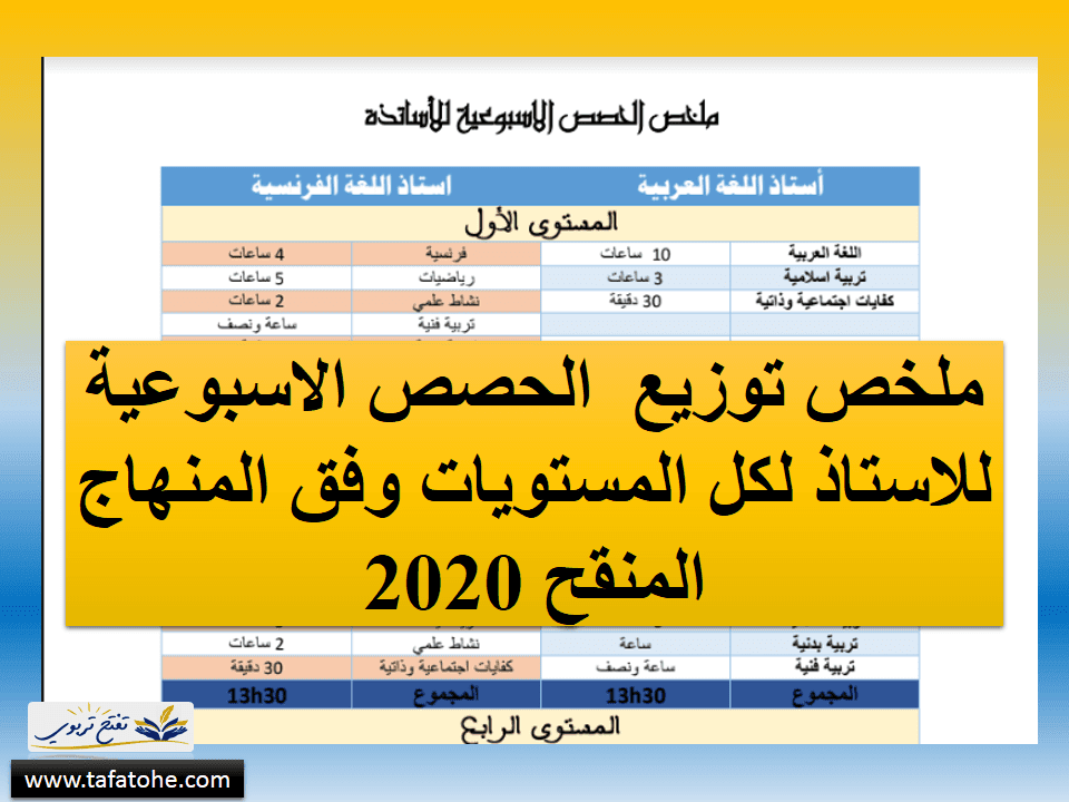 نضع بين ايديكم ملخص توزيع الحصص و الغلاف الزمني الاسبوعي للمواد وفق المنهاج المنقح 2020.