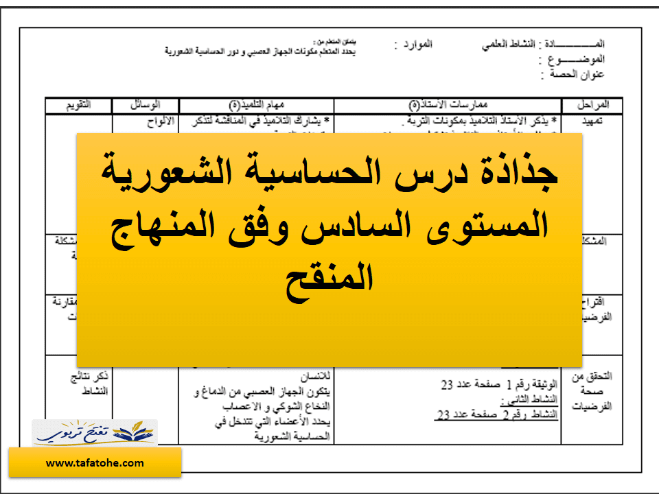 جذاذات فضاء النشاط العلمي المستوى السادس وفق المنهاج المنقح : جذاذة درس الحساسية الشعورية