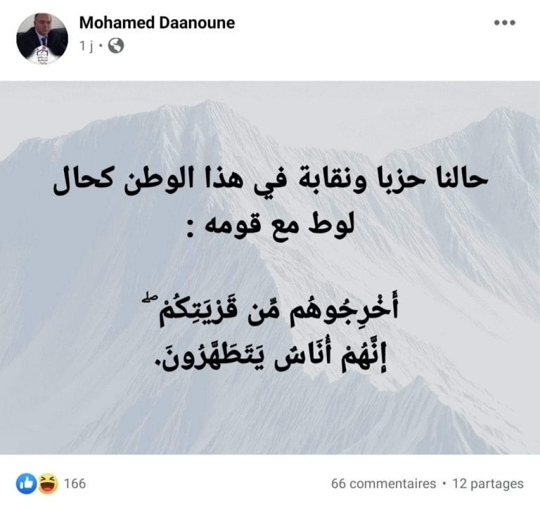 وقال القيادي في البيجيدي حالنا حزباً ونقابة في هذا الوطن كحال لوط مع قومه.